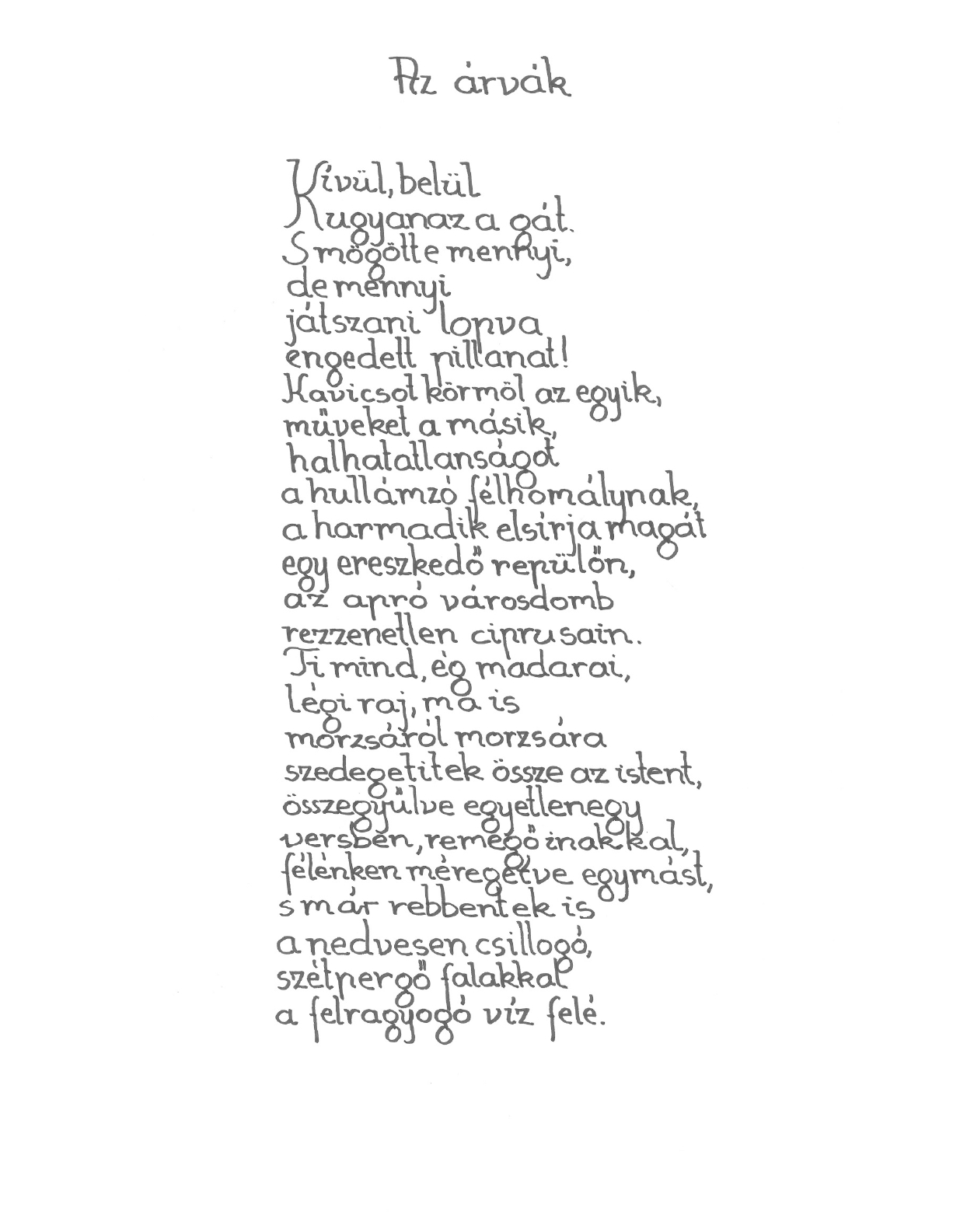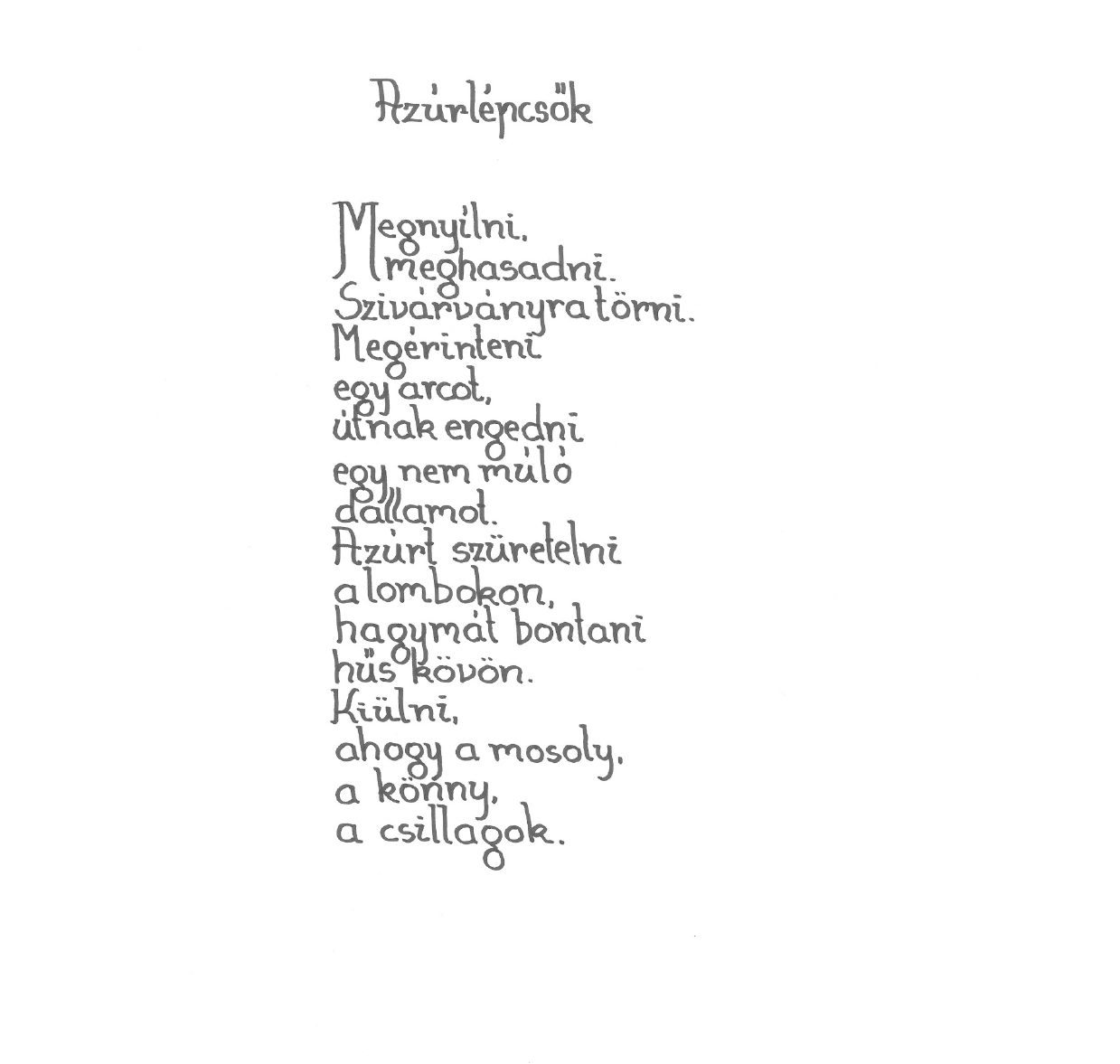 Nem faximilék, de egyenként, külön-külön szerzői kézírottak a kötetpéldányok égkék papírból vágott, hajtott „cingulusainak” távol-keleti tus-írásai.  (Nyilván azzal az írói „előrecsomagolt”, visszakacsintó mosollyal: e játszi fecniket hamar elveszíti a könyvtulajdonosi-olvasói szórakozottság. Akár megannyi névtelen, egyszeri szignót.)