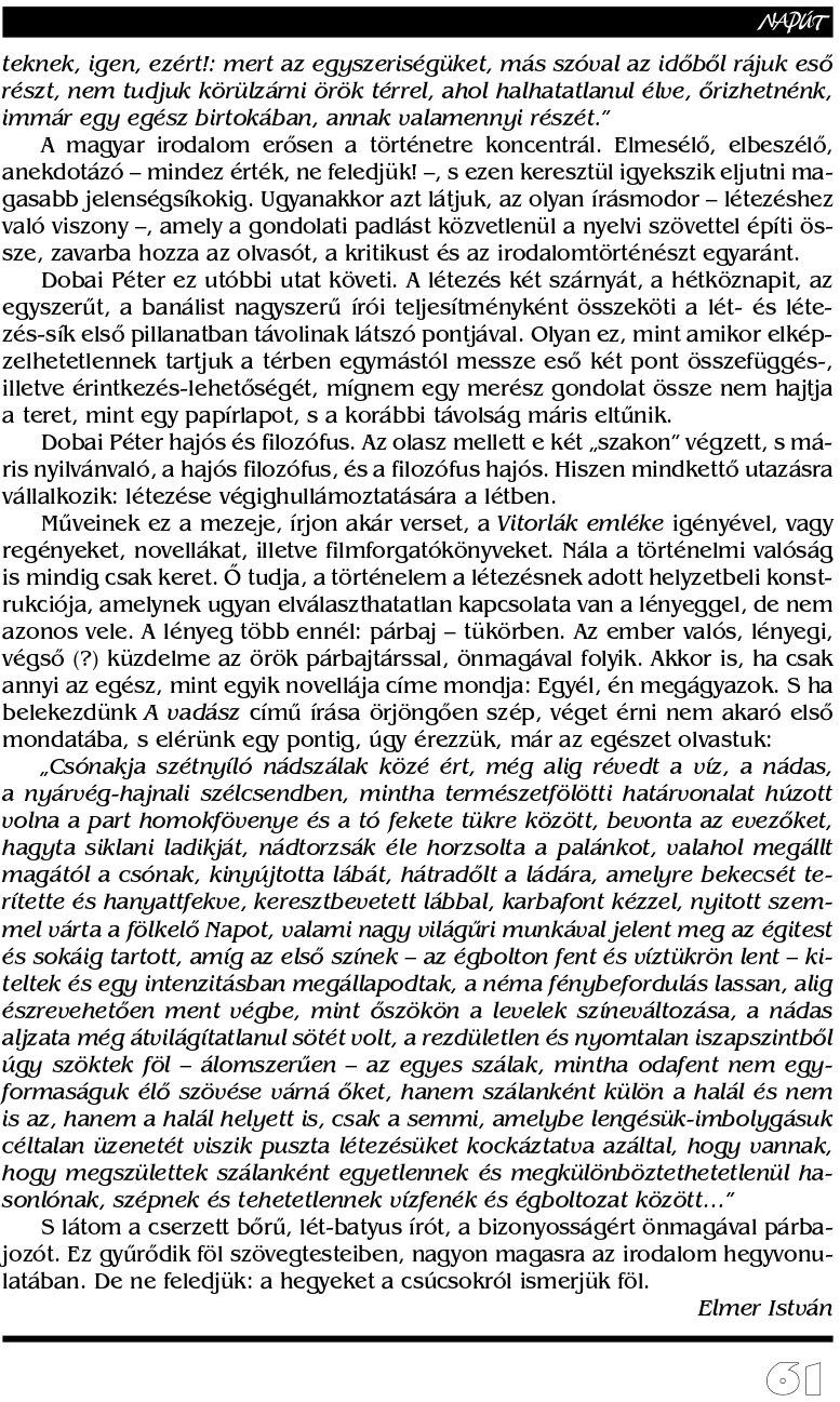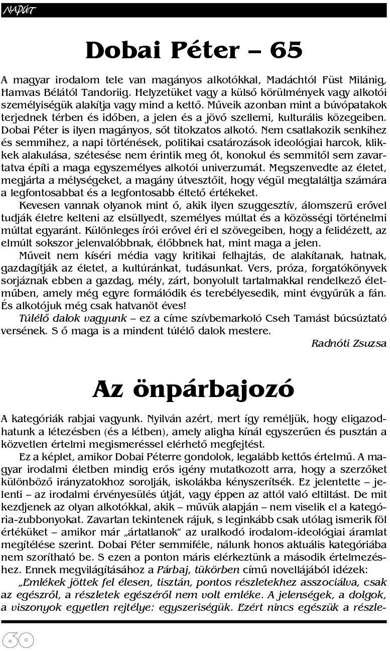Most folytatjuk ugyanonnan, abból a lapösszeállításból, a Csáth-számból; Dobai Pétert 65 évesen ünnepeltük akkor (ld. alább csatolt Napút-oldalait).