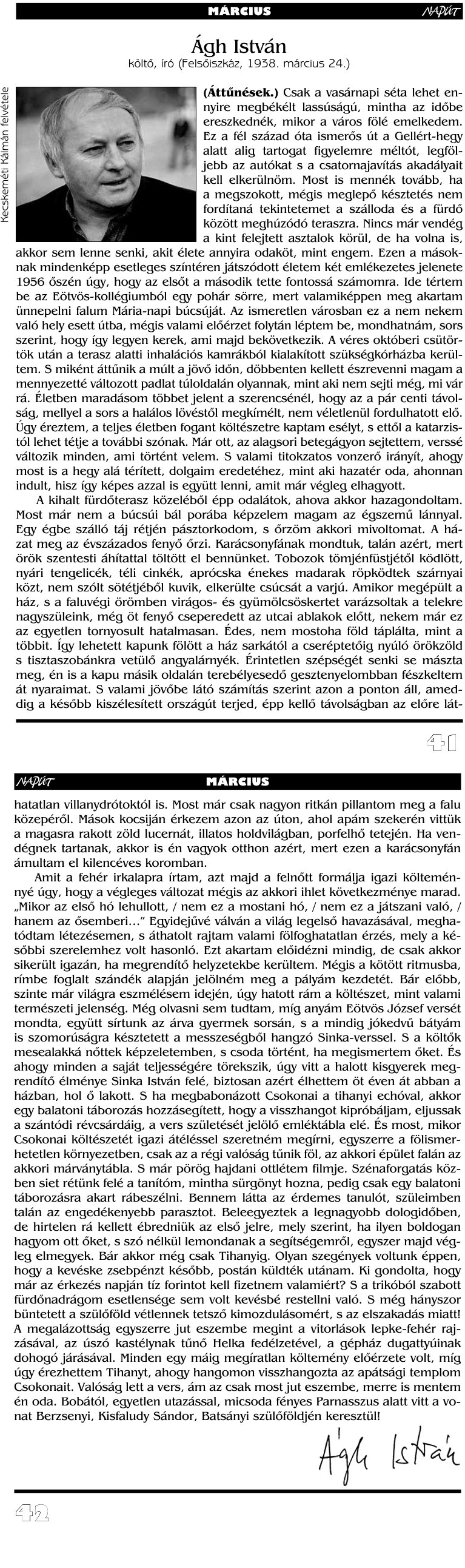 2007 decemberében, hetvenedik születésnapja előtt addigi életét ekként fogalmazta megbékélt bekezdésekbe, így foglalta össze – meghatottan, meghatóan (Napút, IX. évf. 10. sz.):