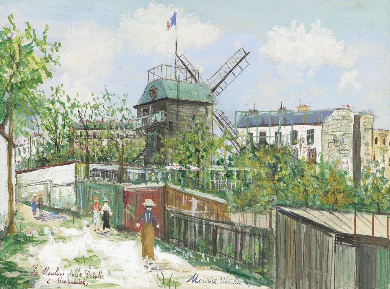 Maurice_Utrillo,_par_Suzanne_ValadonMaurice Utrillo 1883-ban született Suzanne Valadon egyetlen gyermekeként. A montmartre-i festő és több neves művész modellje és szeretője, egyedülálló anyaként nehezen tudta felnevelni Maurice-t, aki iskolakerülő volt, és már gyerekkorában inni kezdett. Miután 1904-ben először elmegyógyintézetbe került, egy orvos azt tanácsolta Valadonnak, hogy terápiaként tanítsa meg fiát festeni. Utrillo az anyjától kapott képeslapokról kezdett festeni, és hamarosan rátalált művészi elhivatására. Több száz festményt készített, többnyire Montmartre közvetlen környezetét ábrázolva. A Belle Époque-nak nevezett időszakban (1890-1914) Montmartre sok művészt vonzott dombtetőn való elhelyezkedése és a párizsi adózás alóli mentességének köszönhetően. Megőrizte rusztikus hangulatát, és a 19. század végére a bohém Franciaország művészeti központja lett. A „vieux Montmartre”-ról (a régi Montmartre) készült képeslapok rendkívül népszerűek lettek, és sok vidéki vagy külföldi képzeletében Montmartre lett a tipikusan párizsi, sőt jelképesen francia negyed. A Montmartre festője, Maurice Utrillo egyik napról a másikra híressé vált, és a legjobban eladható francia festők közé került. Jelentőségteljes, hogy Utrillo soha nem festette meg a Montmartre lábánál elhelyezkedő tipikus helyeket, mint például a Moulin Rouge-t. Ehelyett a Montmartre-domb ikonikus szórakozóhelyeit örökítette meg, különösen a Le Lapin Agile-t és a Moulin de la Galette-et. Ez utóbbi sok szempontból a Moulin Rouge ellentéte volt. A kis táncterem Montmartre utolsó fennmaradt valódi malmában működött. Közönsége kevésbé volt divatos, inkább a munkásosztályból került ki. Az alábbi képen Utrillo nappal ábrázolja a tánctermet, fákkal körülvéve, hátulról szemlélve. Kihagy minden utalást az éjszakai eseményekre, így a malom inkább tűnik egy falusi gabonaőrlőnek, mint szórakozóhelynek.