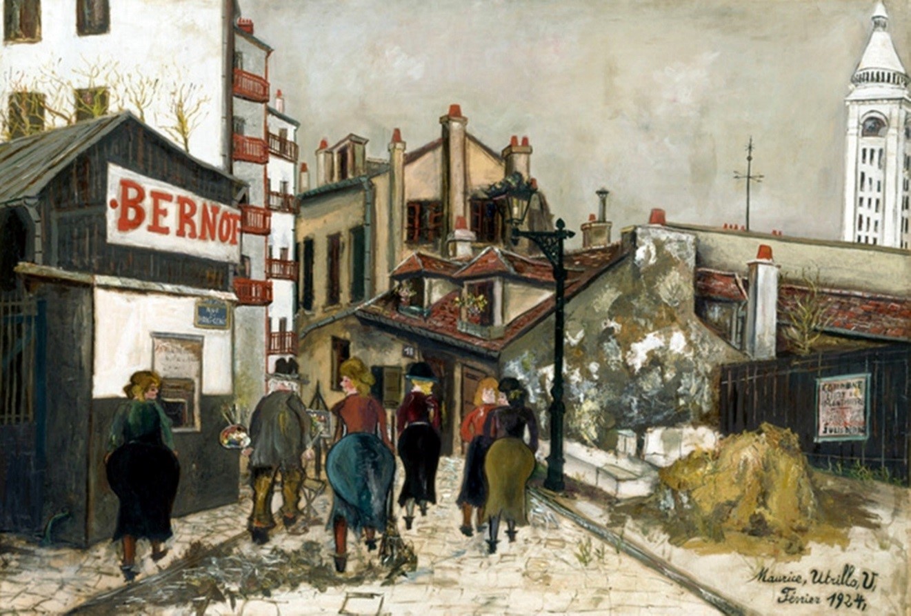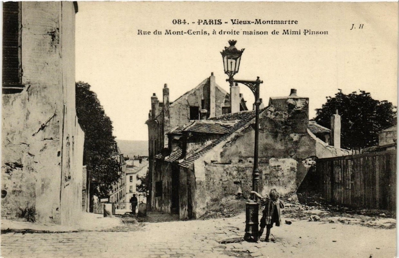 Mimi Pinson nem valóságos személy, Alfred de Musset tollából született, egy 1845-ben írt elbeszélésben, amely a Le Diable à Paris című kiadványban jelent meg. Musset novellájában egy szegény, fiatal lány szerepel, aki egy padlásszobában él, és akibe beleszeret egy bohém költő, Eugène. Ez a bájos, gondtalan, nyomorúsága ellenére is életvidám nő nagy népszerűségre tesz szert, és neve dalokban, operettekben, filmekben is visszaköszön. Ő a ’grisette’ (egyfajta szegény, de életvidám, kedves és nagylelkű varrólány vagy kalaposlány) archetípusa. Az 1924-es La Maison Bernot című festmény szintén a Rue de Mont-Cenis utcán található. Utrillo ezt az utcát több alkalommal is megfestette. A bal oldalon látható egy sötét épület „Bernot” felirattal – ez utalás La Maison Bernot-ra, egy szénkereskedőre, aki olcsó szénrögöket (boulets Bernot) árult a szegény lakosságnak. Ez az üzlet nem szerepel sem más festményein, sem a korabeli fényképeken, így feltételezhető, hogy Utrillo ezzel a szegények életkörülményeire kívánt utalni, különösen a szénhiányos időszakokban. Öt nőalak látható az utcán. Az arcuk nem egyéni, ruházatuk inkább régi időket idéz, mint a korabeli divatot. Négy nőt hátulról látunk, egy szembejön. A középső, kék szoknyás nő seprűt tart, és talán szemetet vagy lombot söpör össze, közben beszélget a mellette állóval. Ez egy tipikus falusi jelenet.