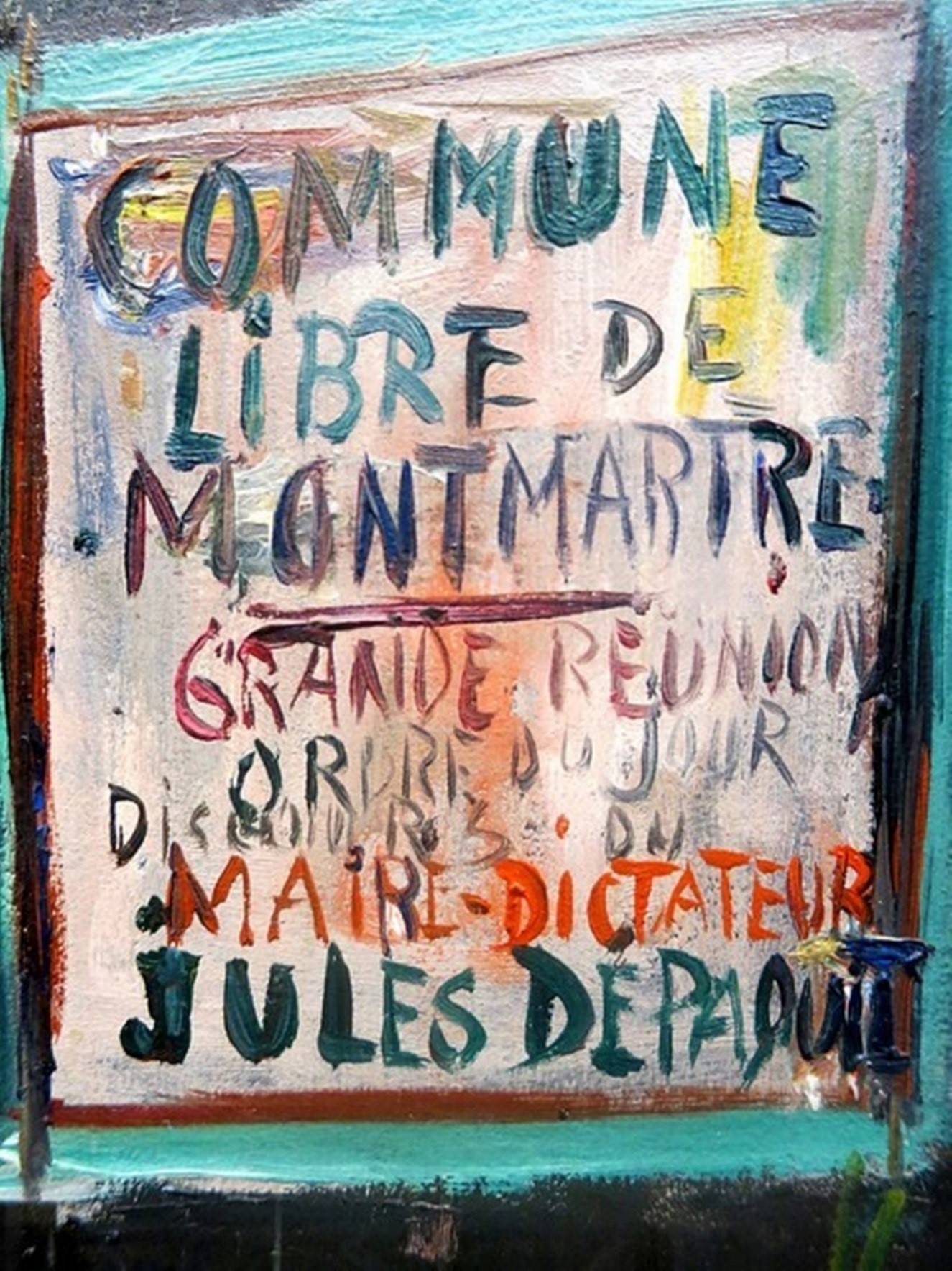 A plakát szövege: A Montmartre-i Szabad Kommuna – Nagygyűlés. Napirendi pont: Jules Depaquit polgármester-diktátor beszéde. Ez utalás a szervezetre, amelyet néhány művész alapított a Le Lapin Agile kabaréban 1920. április 11-én. Vezetőjük Jules Depaquit karikaturista és költő volt, aki kikiáltotta Montmartre függetlenségét. Ez nemcsak szatirikus gesztus volt. A szervezet célja a Butte falusias, munkásnegyedi karakterének megőrzése volt.