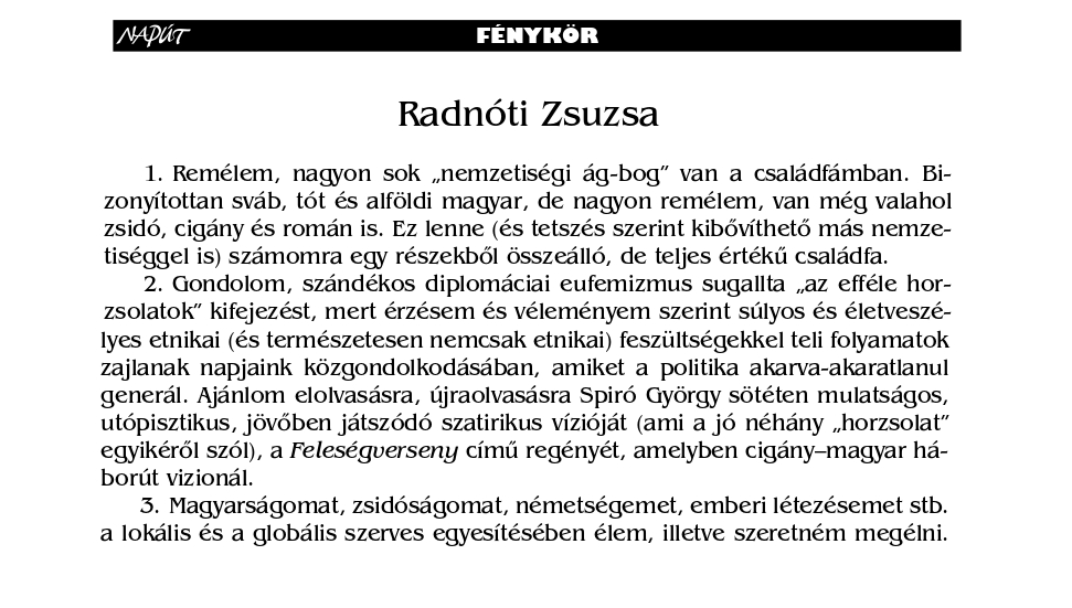 ([Fénykör 7] Megkerestünk sokakat, válaszokat kaptunk többektől, köszönjük; adjuk közre mind a tizenötöt. 1. Található-e nemzetiségi ág-bog a családfáján? 2. Szunnyad-e ma bármilyen (jellegű, fokú) etnikai feszültség Magyarországon, érzékel-e efféle horzsolatot? 3. Miként éli meg… magyarságát, zsidóságát, németségét stb.?)