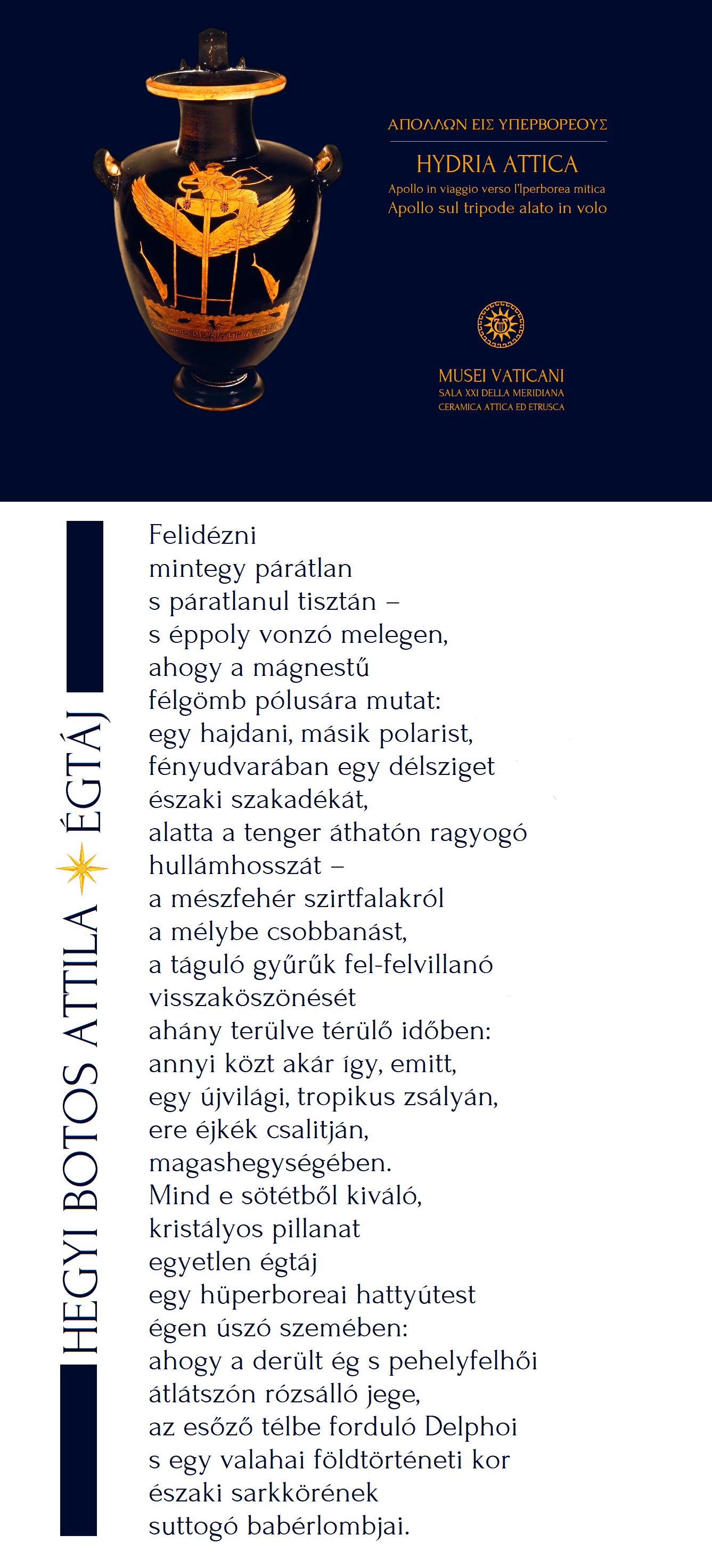 ⇒Címkép letöltés Ha már e címképi égtájláttatásban a latin műveltség mozgásba hozása: érdekességképp ld. a (⇒korai, még etruszk) római s a görög tájolás (pl. oionopoloszok) ellentétes orientálódásait (arccal délnek, arccal északnak). Így: már e kezdő vizuális mozzanattal történhet egy bújtatott, tovább gondolható (oda-vissza)utalás egy összetett kérdéskörre: a polaritásra – ahány vonatkozásával. (Ahogy voltaképp esett ez korábban magával a versírással is: egy barát kért északi tematikájú líra megírására: létezhet ennél paradoxabb érzelmi helyzet egy zsigerien délszaki lelkületnek?!* Quanta plaga!**)