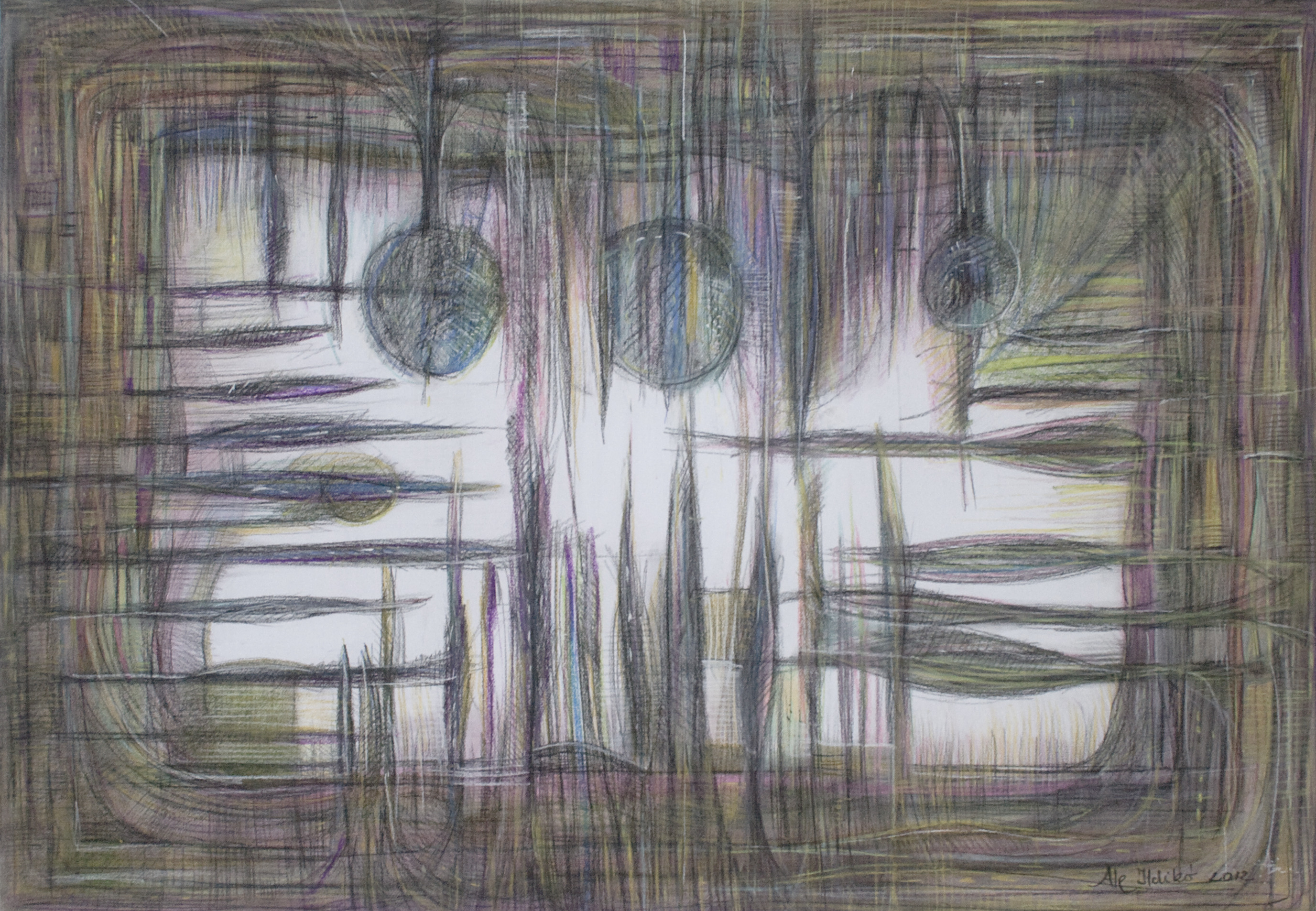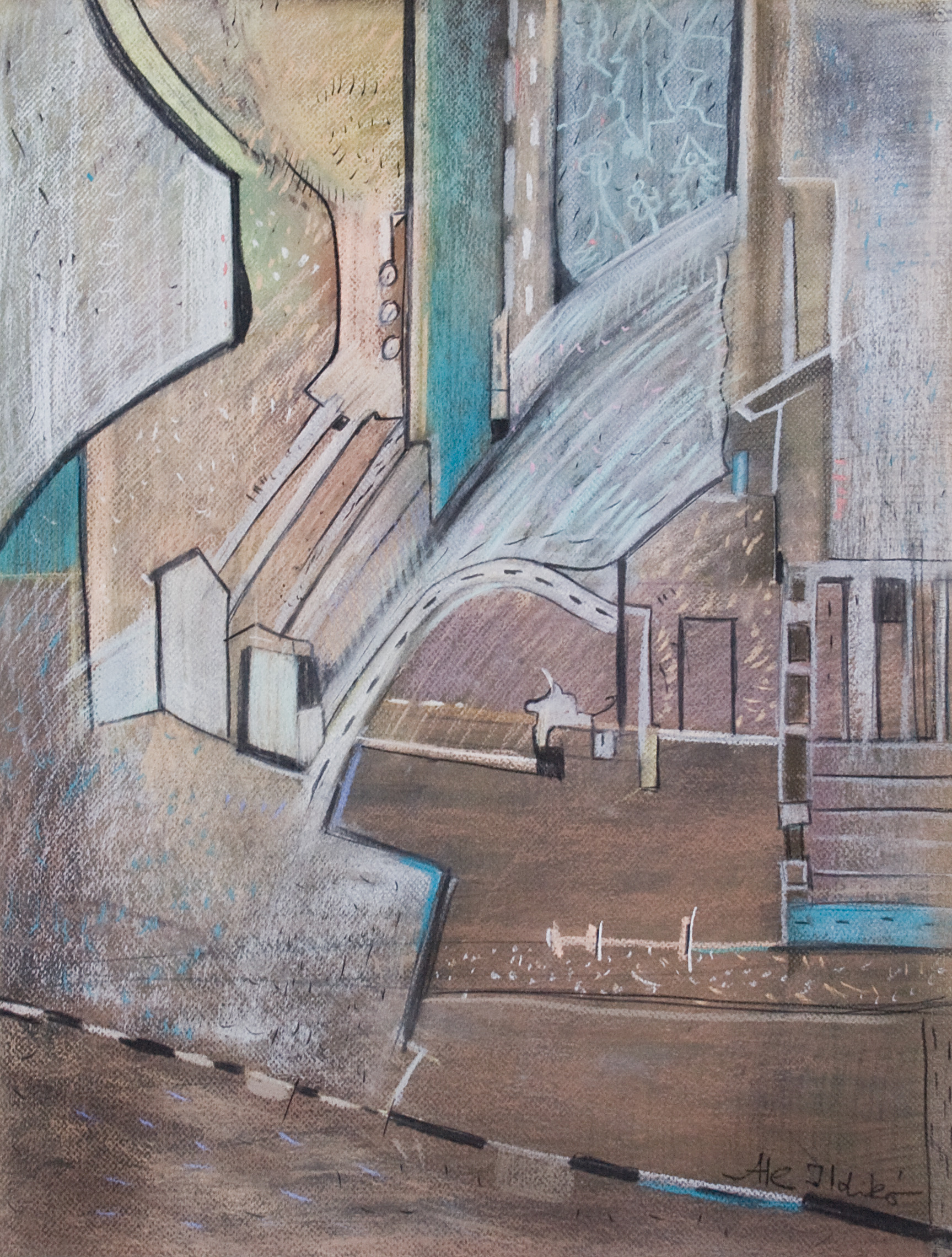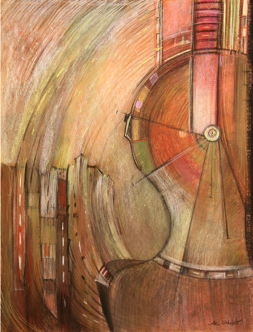 Bár az újkori civilizáció folyamatosan ennek ellenkezőjéről igyekszik meggyőzni bennünket, mégis: „… az ember soha nem tud teljesen megszabadulni a transzcendencia és a metafizika iránti érzéktől. (…) A szellem lényege éppen a végtelen mozgás képessége, a tárgyi világ átjárhatósága. Az ember attól szellemi lény, hogy határa mintegy a végtelen.” (Földényi F. László: Az ész álma. 33 esszé [„Csak a bolondok nem félnek semmitől sem…” Félelem és szabadság, 74. old.], Kalligram, Pozsony, 2008) Az út: ennek a végtelennek a bejárására tett kísérlet? Ale Ildikó képei (mint a Holdkóros biciklista két alkotása is) több rétegben feltett porpasztellel készülnek. Az utak és színterek rétegei a halvány és mély tónusú pasztellvonulatok váltakozásai. Egyetlen olyan kép van a tárlat anyagában, amelyen megmaradt az eredeti fehér papíralap egy részlete: a Simai Mihály verséhez készített „együttrezgések” című alkotás, amely az „út”, „utak” fogalomkörét sajátos, művészi lélekvándorlásként jeleníti meg. A világló fehér felület a szellem metafizikus terét idézheti.